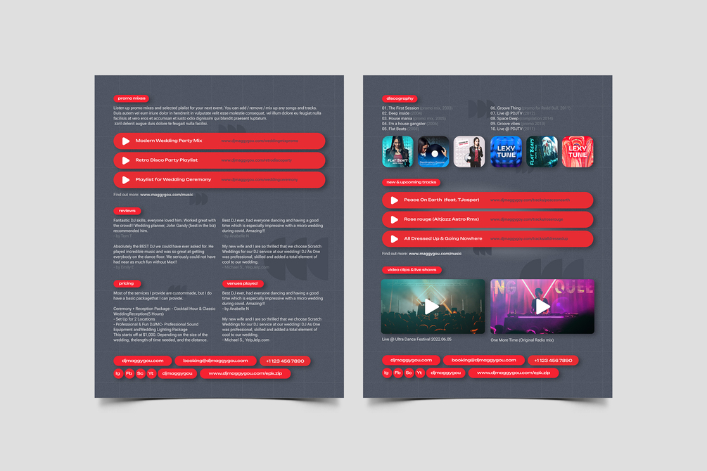- Multiple Page Layouts: Includes various pages, such as bio, discography, press coverage, social media links, and contact information, allowing you to create a complete press kit in no time.