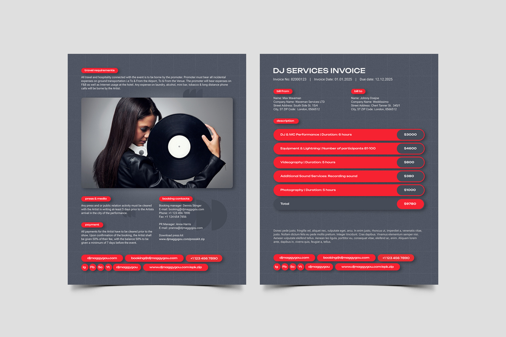 Complete Media / Press Kit Pack for professional DJ / MC / Producer included: modern press kit template, technical and hospital rider, DJ resume, DJ invoice, business card for DJ and music cover artwork templates.