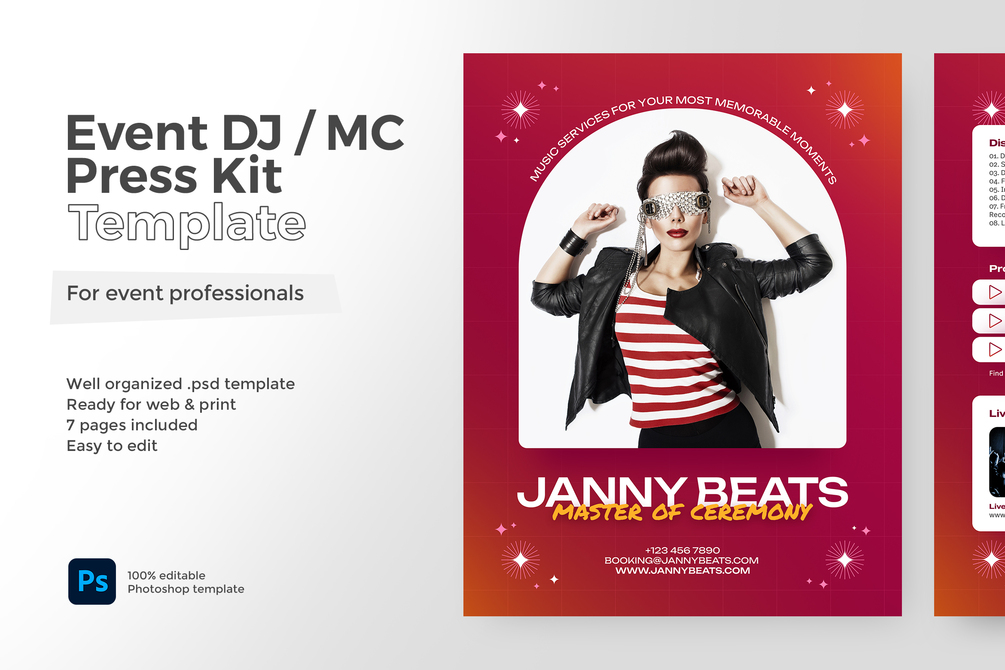 • Multiple Page Layouts: Includes various pages, such as bio, discography, press coverage, social media links, and contact information, allowing you to create a complete press kit in no time.
